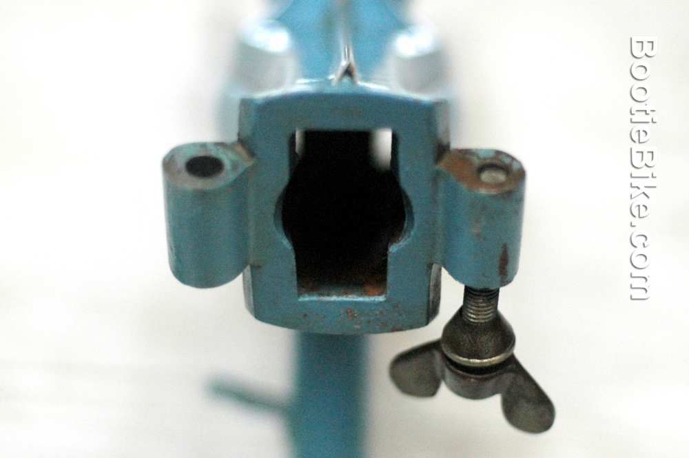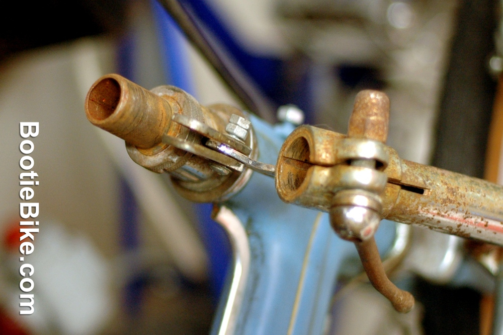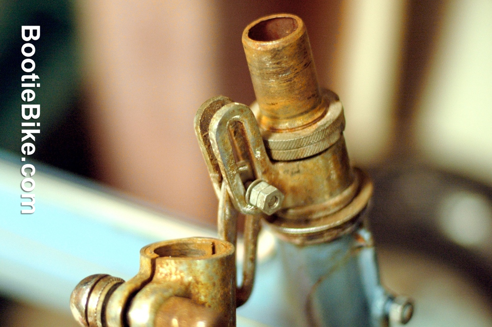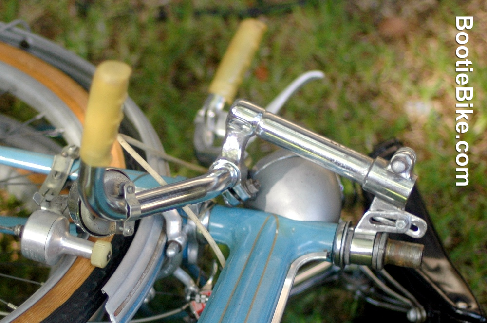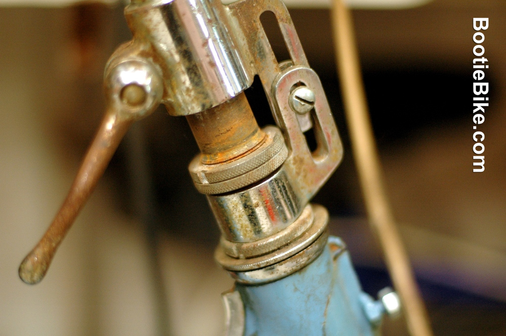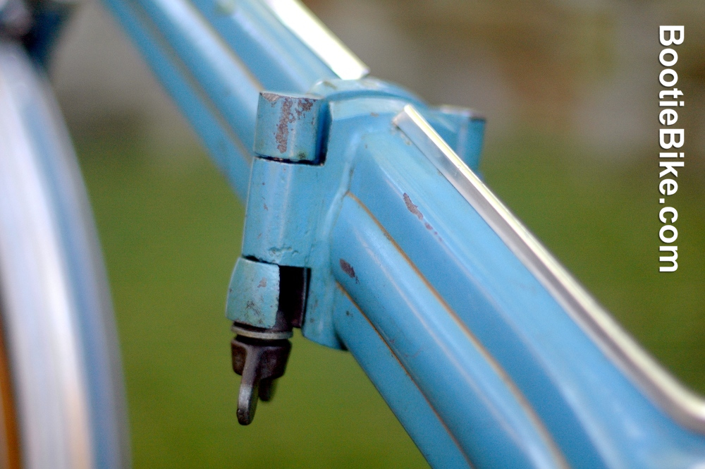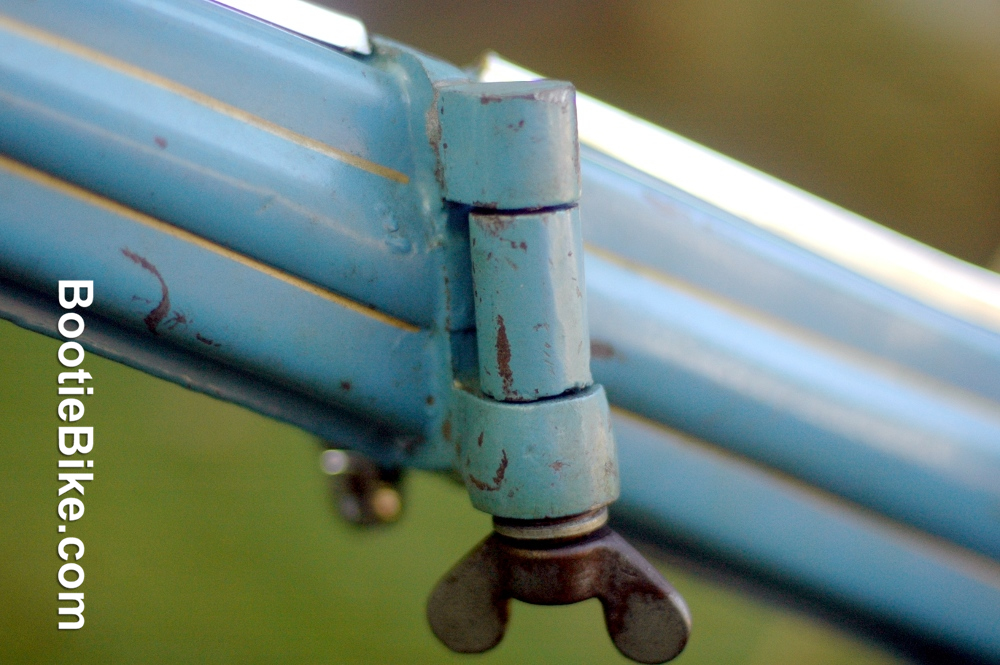 At least folding the bike is straightforward, or I think so anyway; simply undo a wing nut on the hinge. With that done the handlebars can be tucked out of the way, and to this end the handlebar stem is split into two. A screw release allows the upper part of the stem, with bars, to be lifted off the lower part and swung over to one side. A small screw through a slotted tab on each piece keeps the upper part from going astray. Unfortunately, this arrangement precludes any height adjustment for the handlebars. I may think folding the Neckermann is easy enough, but the Authentic Vintage Bicycles website begs to differ, describing it as an ordeal to say the least, usually involving damage to fingers, bike, or both!