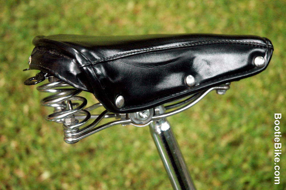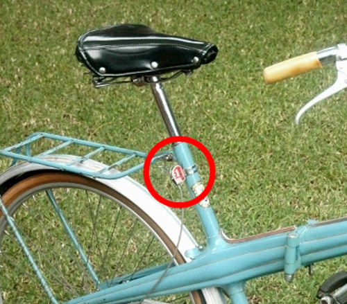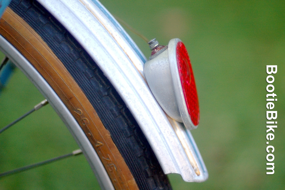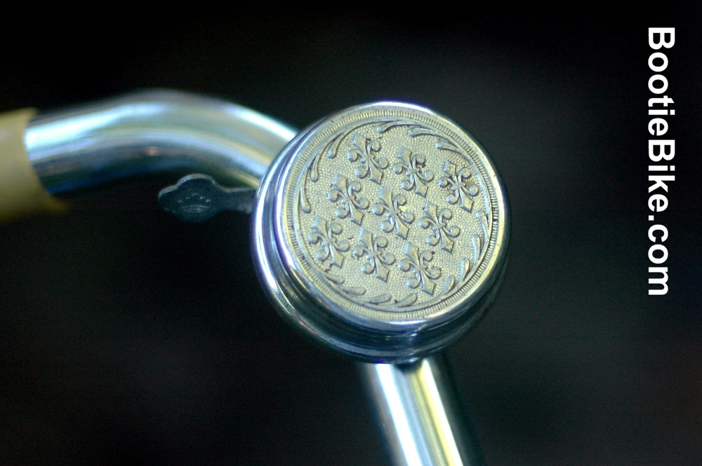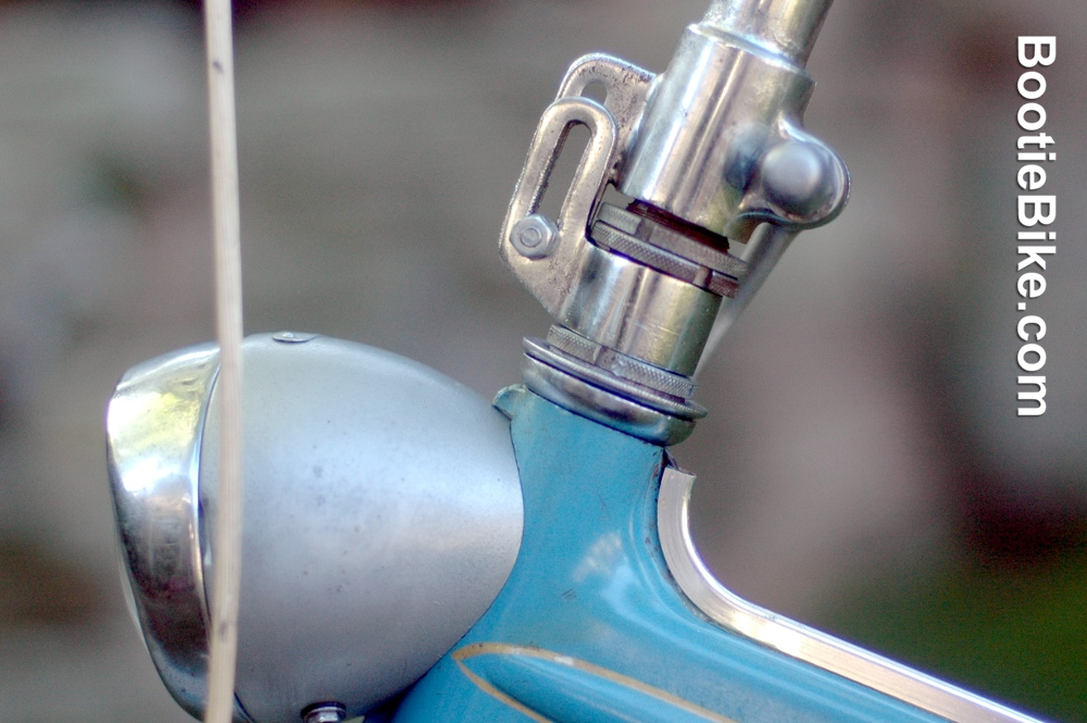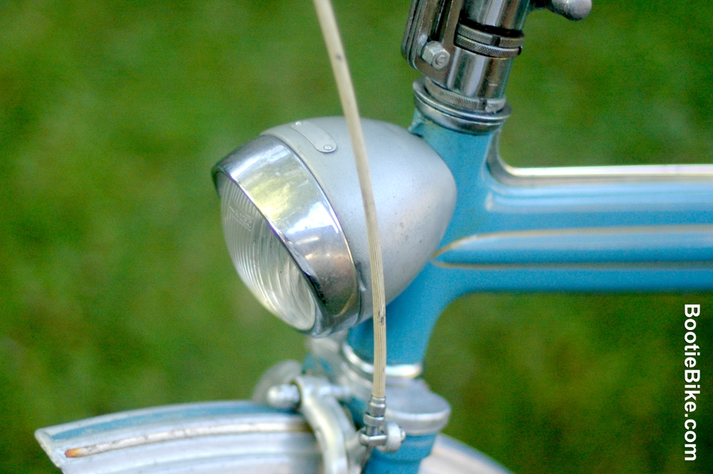 The comfy saddle comes courtesy of Mertens, and the bell is by the old-established and still-extant German bicycle accessory firm 'Trelock'. The pedals have coloured-glass (yes, glass) reflectors. The bike came equipped with a friction dynamo lighting set.