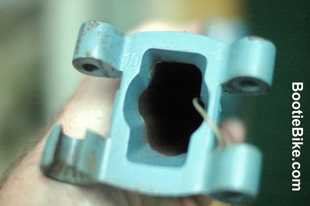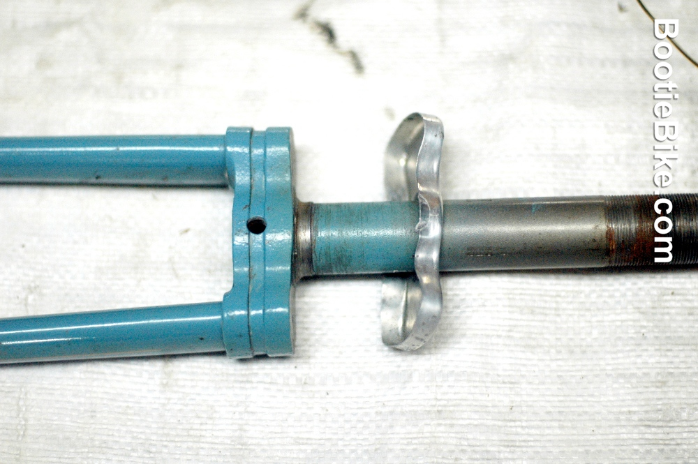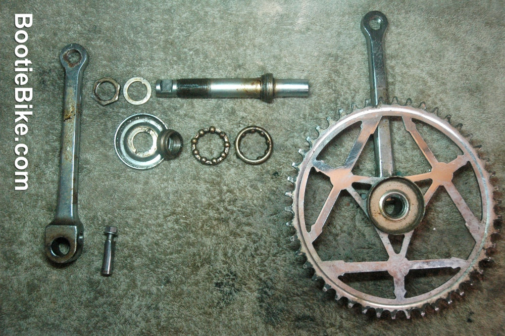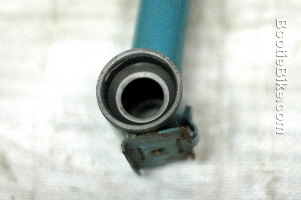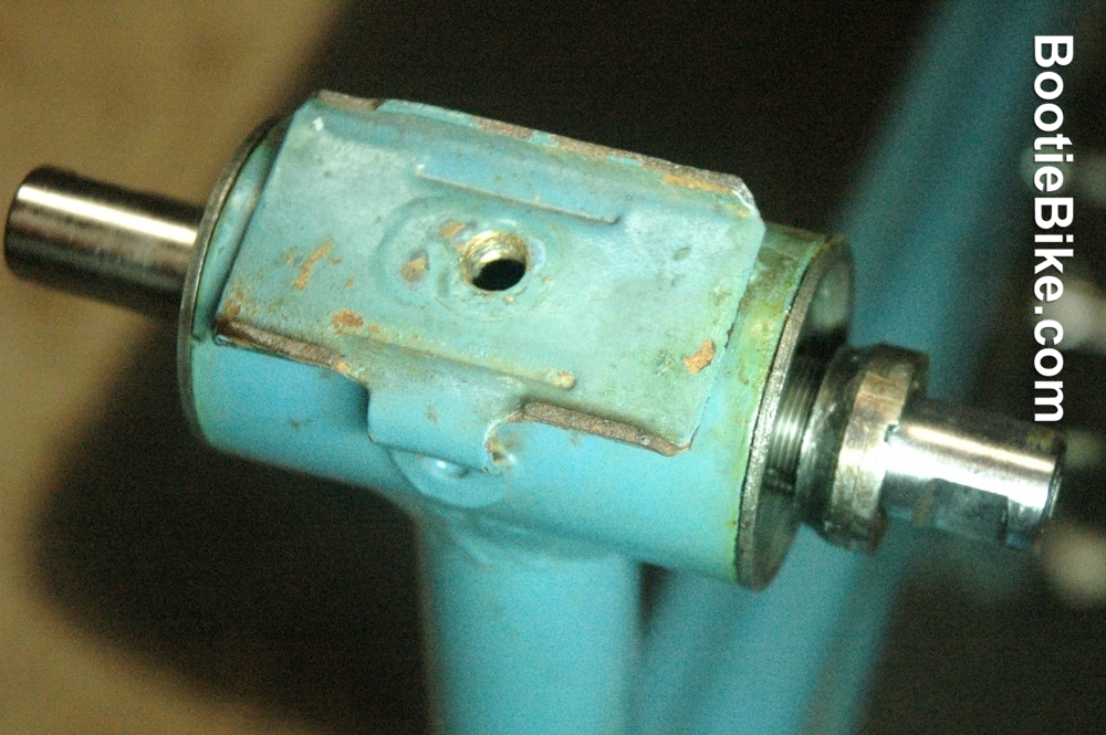 Speaking of the bottom bracket, this example is a little unusual, being of the 'Thompson' type (a first for Bootiebike). It is rather like a scaled-up version of the familiar cup and cone arrangement used for wheel bearings. The bearing cups, fixed in the bottom bracket shell, face outwards. The cones are on the (threaded) spindle; one is fixed, the other screws inwards to adjust the play.