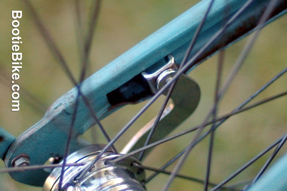 Those of us familiar with only Sturmey Archer hubs will be intrigued by the little sleeve with a stepped tab clinging to the indicator nut. It's there to aid gear adjustment (I think the gears are adjusted correctly when, while in top gear, the locknut is adjacent to the last 'step'). Another little feature to make life easier is the securing of the coaster brake arm in the channel formed by the left chainstay. The end of the arm just slots in – there's no screw and nut to worry about.