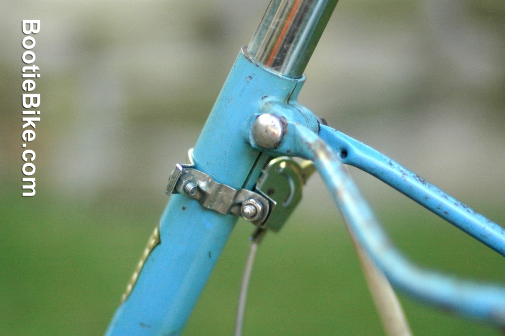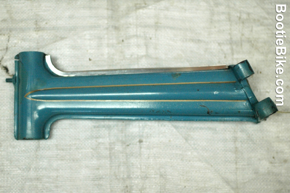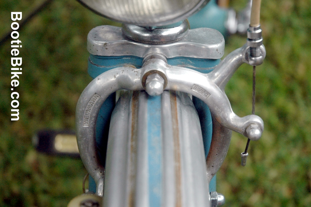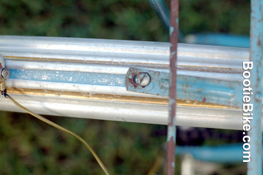 The original spoke nipples were of plated steel rather than brass, and were thus terminally rusty; The spokes rusted too, but somehow they were salvageable. The mudguards have the same 'alloy’ plating as the rims, but this is compensated by the application of gold and blue striping. This must have looked stunning when the bike was new, which is something I doubt anyone ever said about the crude metal strap struggling to support the rear guard.
