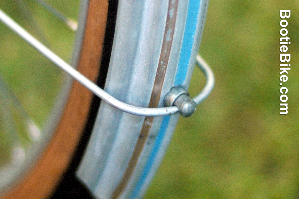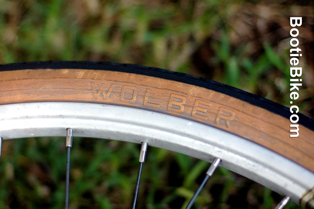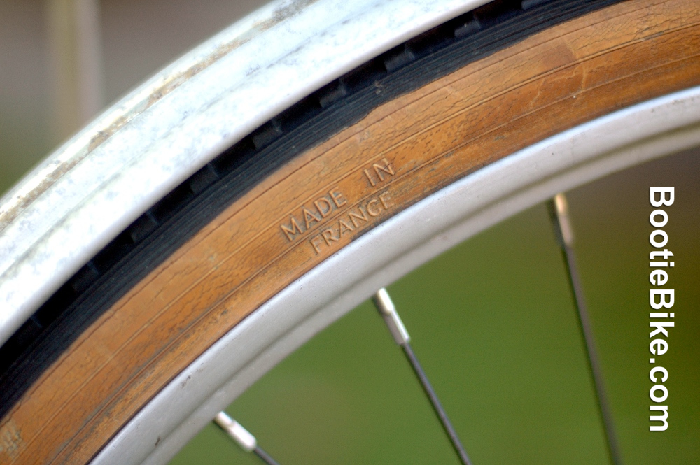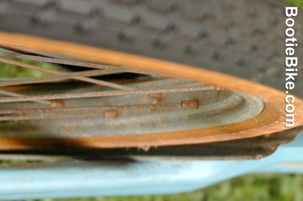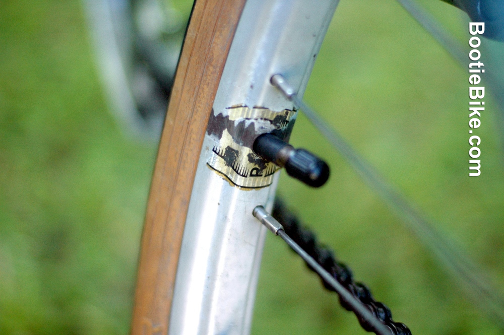 The original French Wolber semi-balloon gumwalls survive, albeit with much superficial sidewall cracking. They look great and give a nice comfy ride. However, they live on wheels of doubtful quality, which is surprising for such a costly bike. For a start, the rims seem very flimsy, certainly nothing like the rims on the English bikes of that era. (On the other hand,