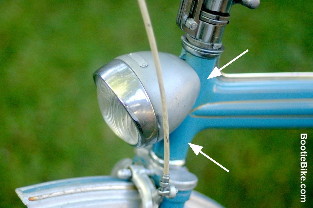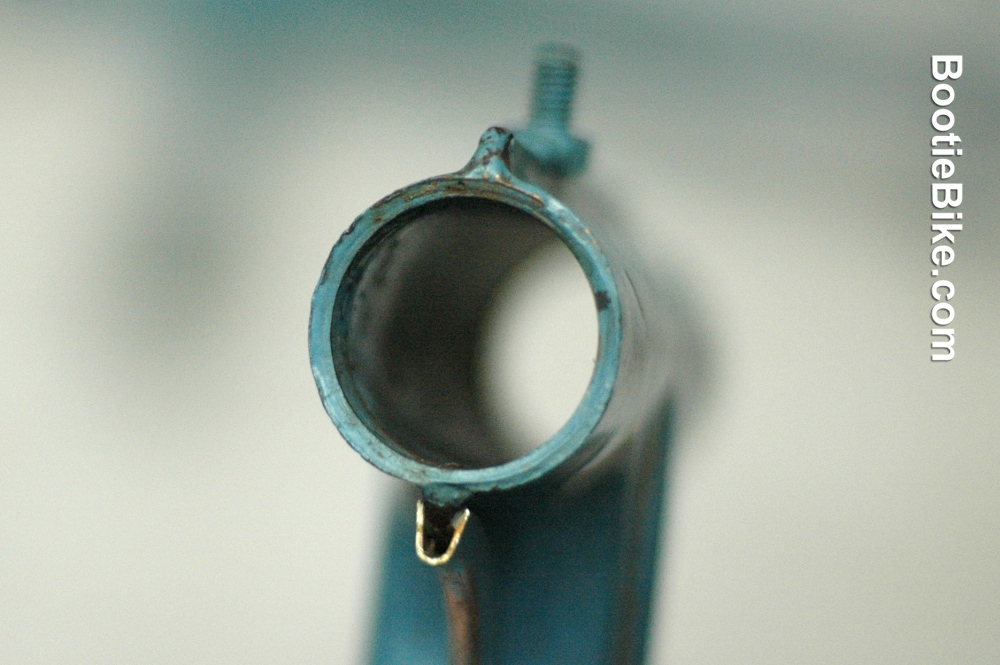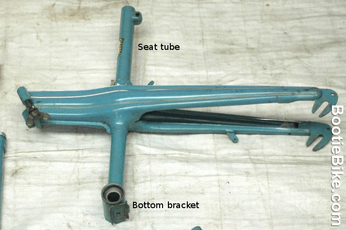 would normally be the steer tube. The distended rear section is intersected at 90° by the seat tube (which extends some distance below to support the bottom bracket), beyond which it bifurcates to form the chain stays.