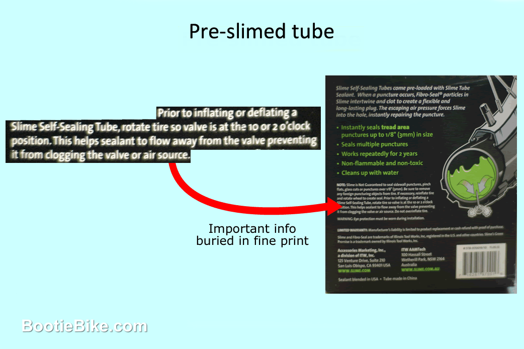 Lesson: Before inflating a slimed tube, drain any slime from the valve stem. This means locating the valve at roughly 5 o'clock or 7 o'clock for a few minutes before inflating. A second, very close look at the box revealed this wisdom, but it was buried deep in the fine print, and only legible to this old fogey with the aid of a magnifying glass.